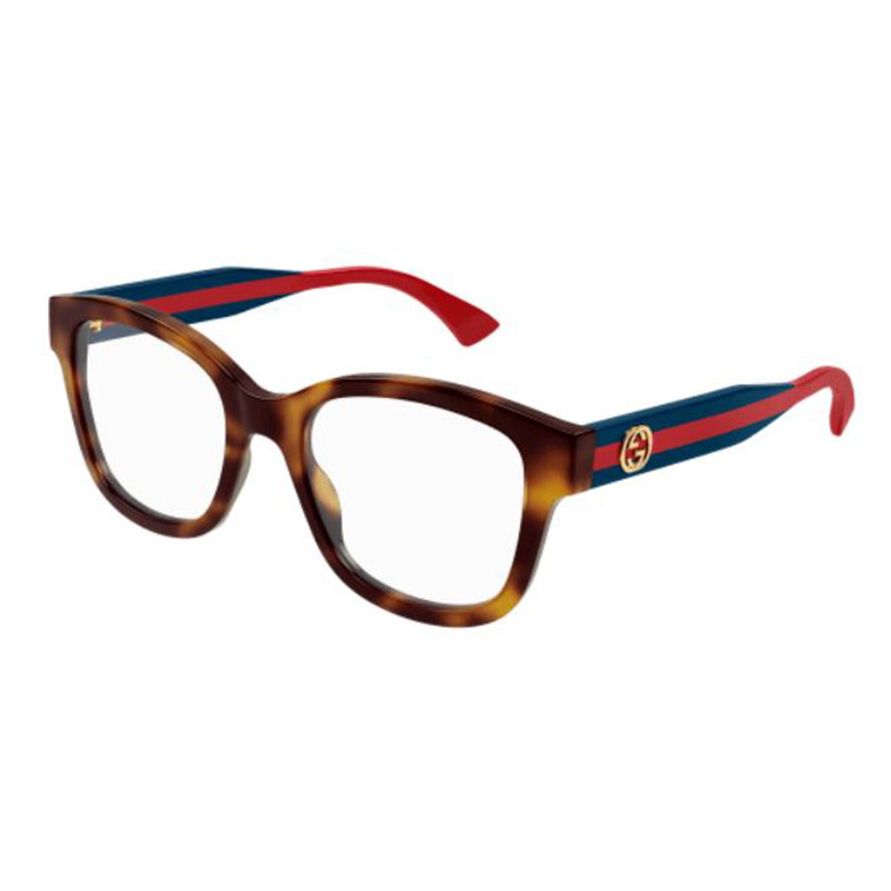 Montatura commerciale con dettaglio Web sulle aste di media altezza. Forma squadrata. Logo GG Interlocking sull’asta Web. Palette di colori commerciali ma cool, con dettaglio Web nelle tonalità canoniche: verde/rosso/verde e blu/rosso/blu.