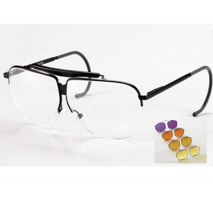Occhiale da tiro in metallo nero opaco con parasudore, alleggerito dal filo in nylon che sostiene la lente, ponte (naso) fisso, aste flessibili con terminale a riccio.